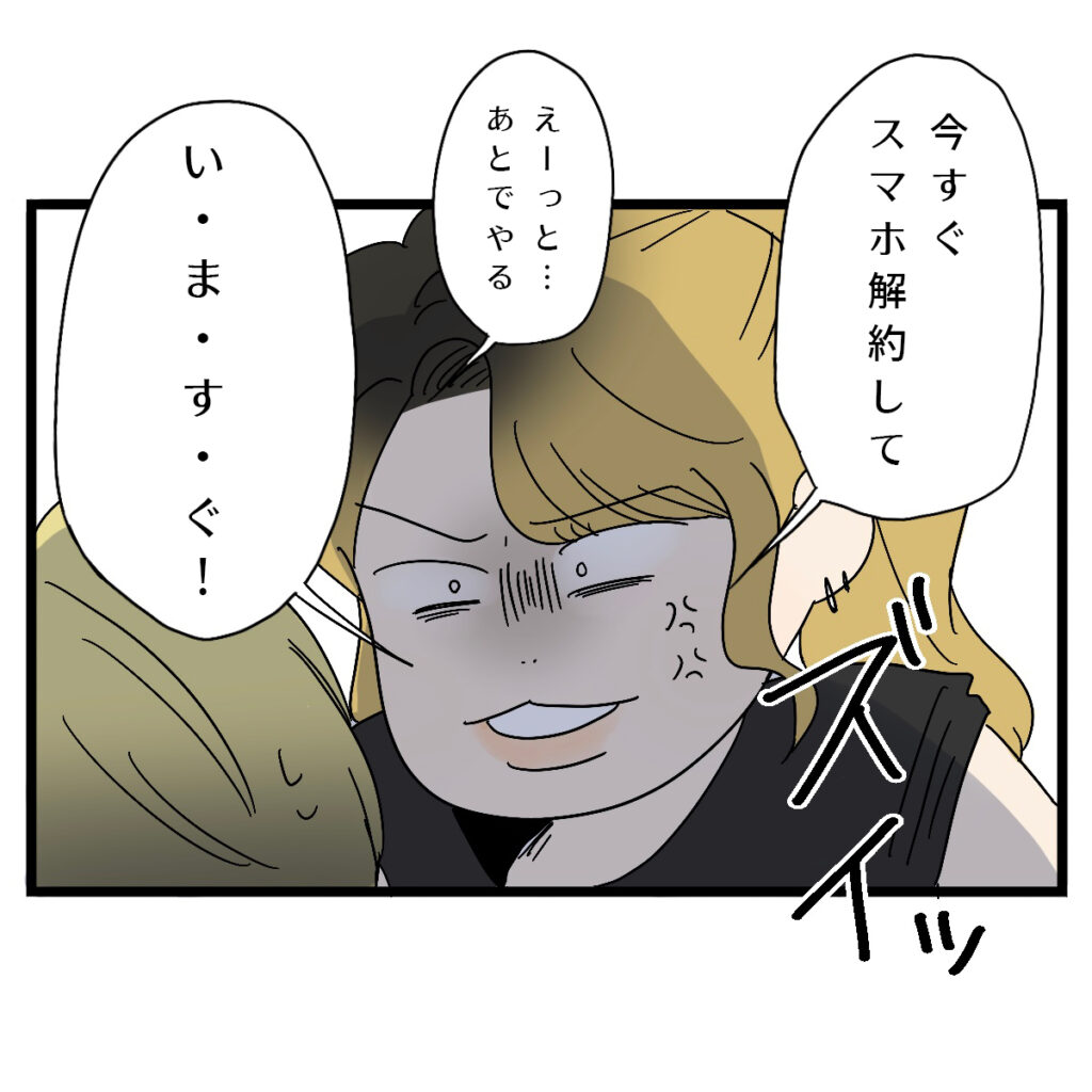 サチさんは信也さんにズイッと顔を近づけると、鬼のような形相で「今すぐスマホ解約して」と言いました。「えーっと・・・あとでやる」と逃げようとする信也さんでしたが、サチさんに「い・ま・す・ぐ!」と念を押されます。
