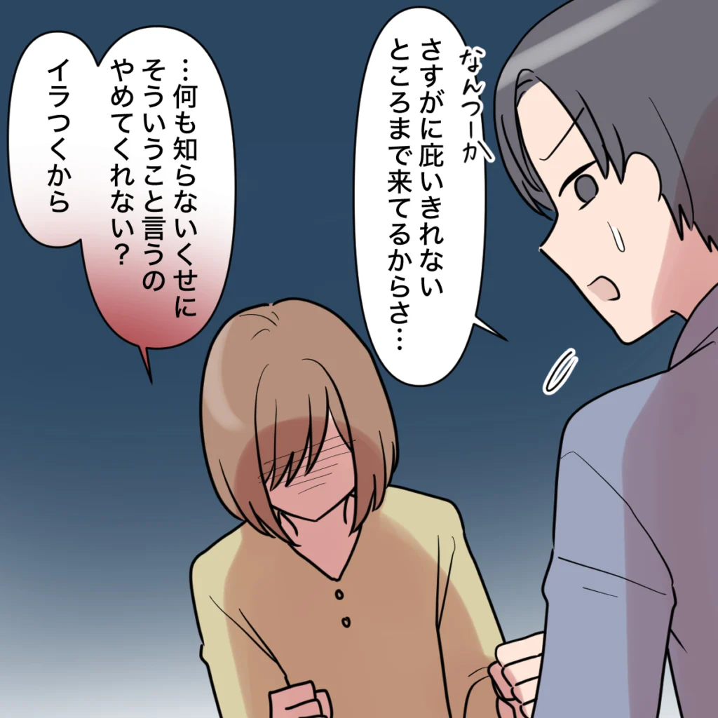 「なんつーか、さすがに庇いきれないところまで来てるからさ・・」と言い出し、「・・何も知らないくせに、そういうこと言うのやめてくれない?イラつくから」と静かに言うと、