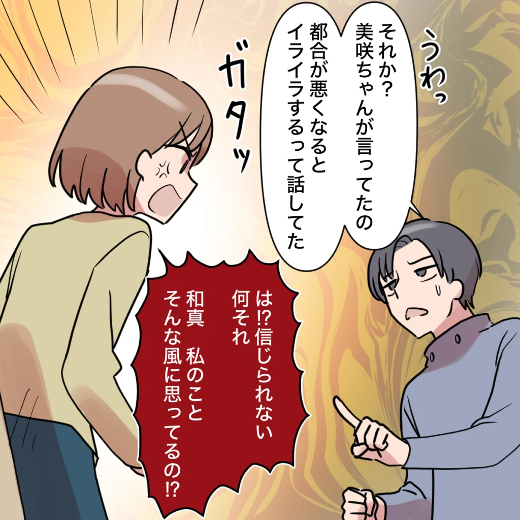 「うわっ、それか?美咲ちゃんが言ってたの。都合が悪くなるとイライラするって話してた」和真の言葉に、「は!?信じられない!何それ。和真、私のことそんな風に思ってるの!?」私の話を全く聞こうともせず、田中さんが言ったことを鵜呑みにしている和真に腹が立ってそう言うと、