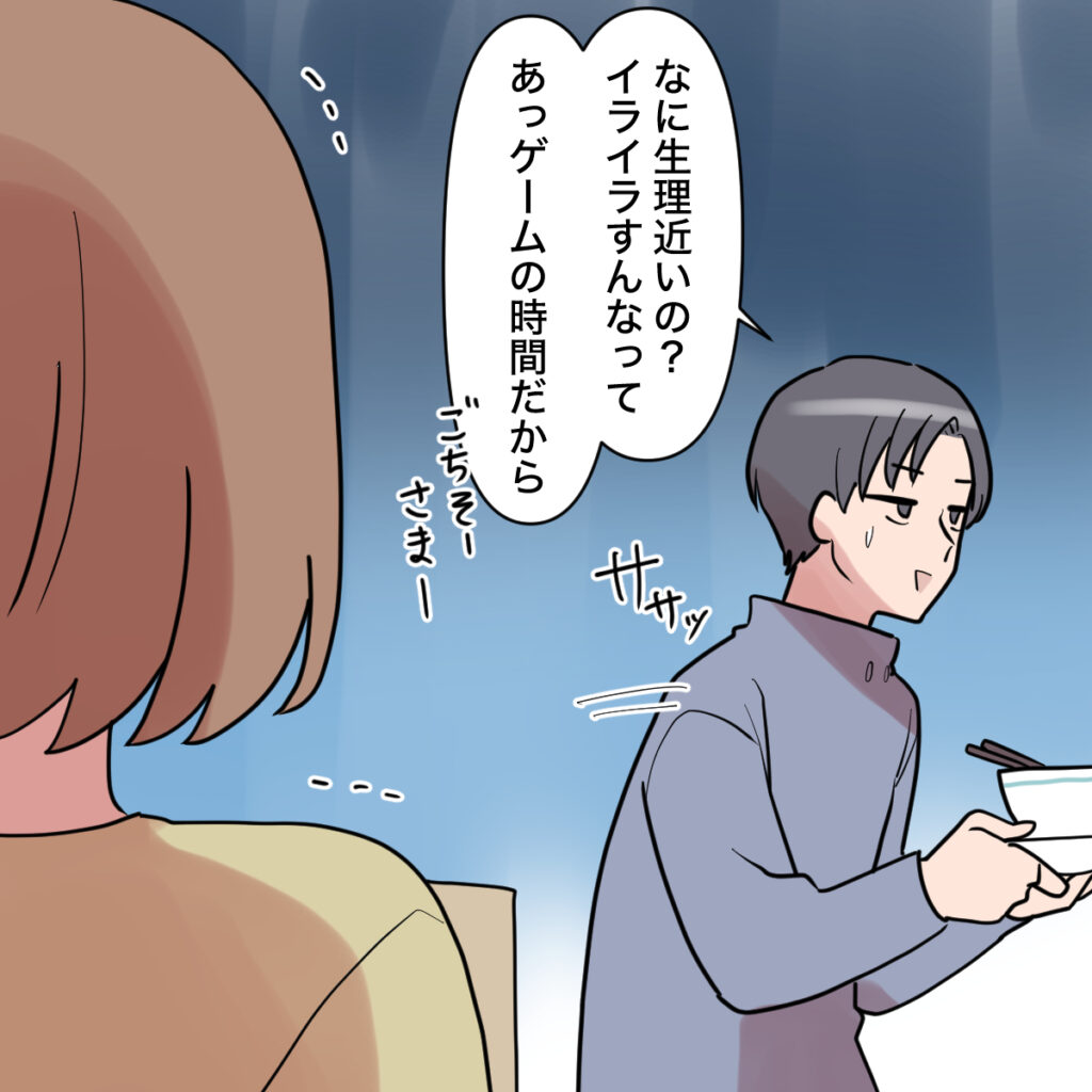 「なに、生理近いの?イライラすんなって。あっ、ゲームの時間だから。ごちそーさま」そう言って食器を持ち、そそくさと部屋に行ってしまい、私は怒りが肩を震わせていました。