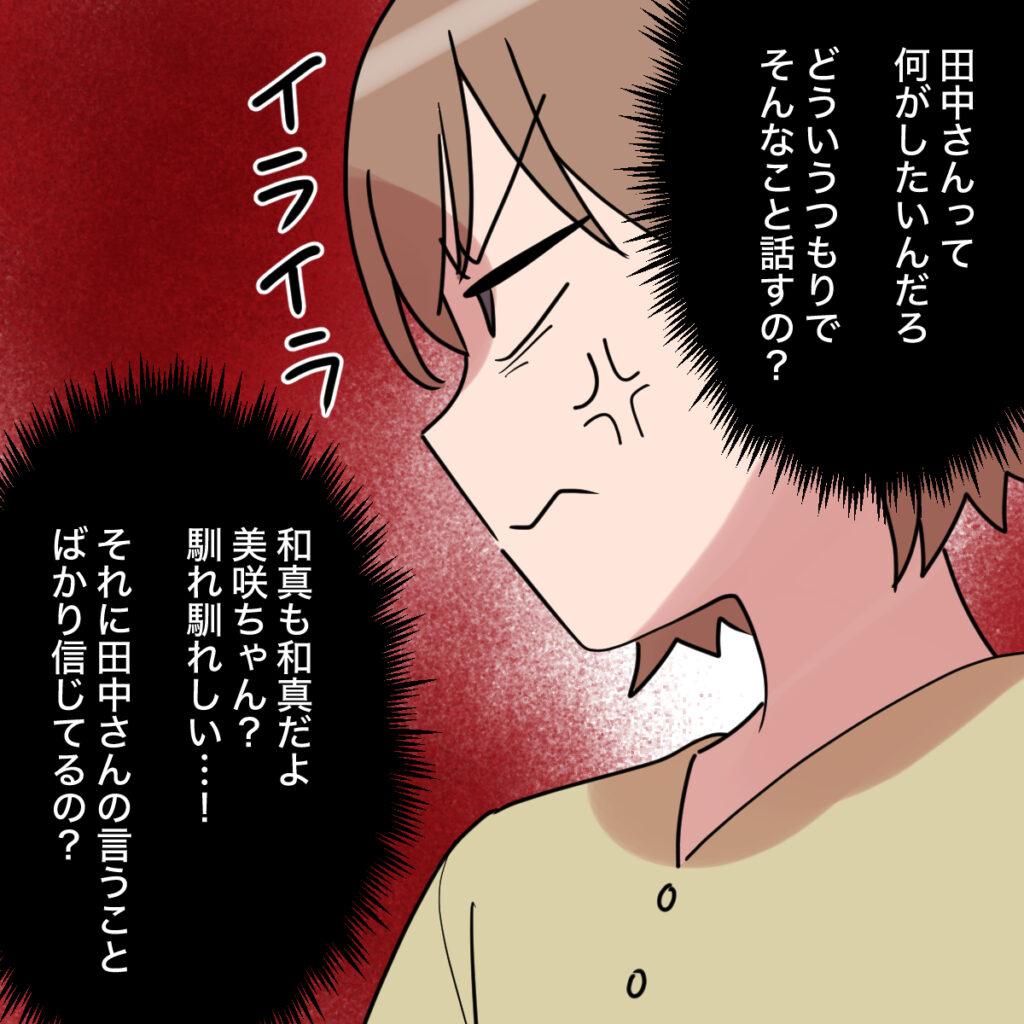 そして、「田中さんって、何がしたいんだろ。どういうつもりでそんなこと話すの?」考えれば考えるほどイライラが止まらない私。「和真も和真だよ。美咲ちゃん?馴れ馴れしい・・!それに、田中さんの言うことばかり信じてるの?」和真の態度を思うと、イライラがおさまりませんでした。
