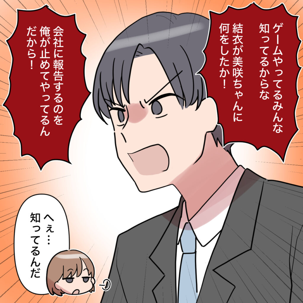 そして、「ゲームやってるみんな知ってるからな。結衣が美咲ちゃんに何をしたか!会社に報告するのを俺が止めてやってるんだから!」と怒鳴りだす和真。「へぇ・・知ってるんだ」呆れてため息をつきながら呟く私に、