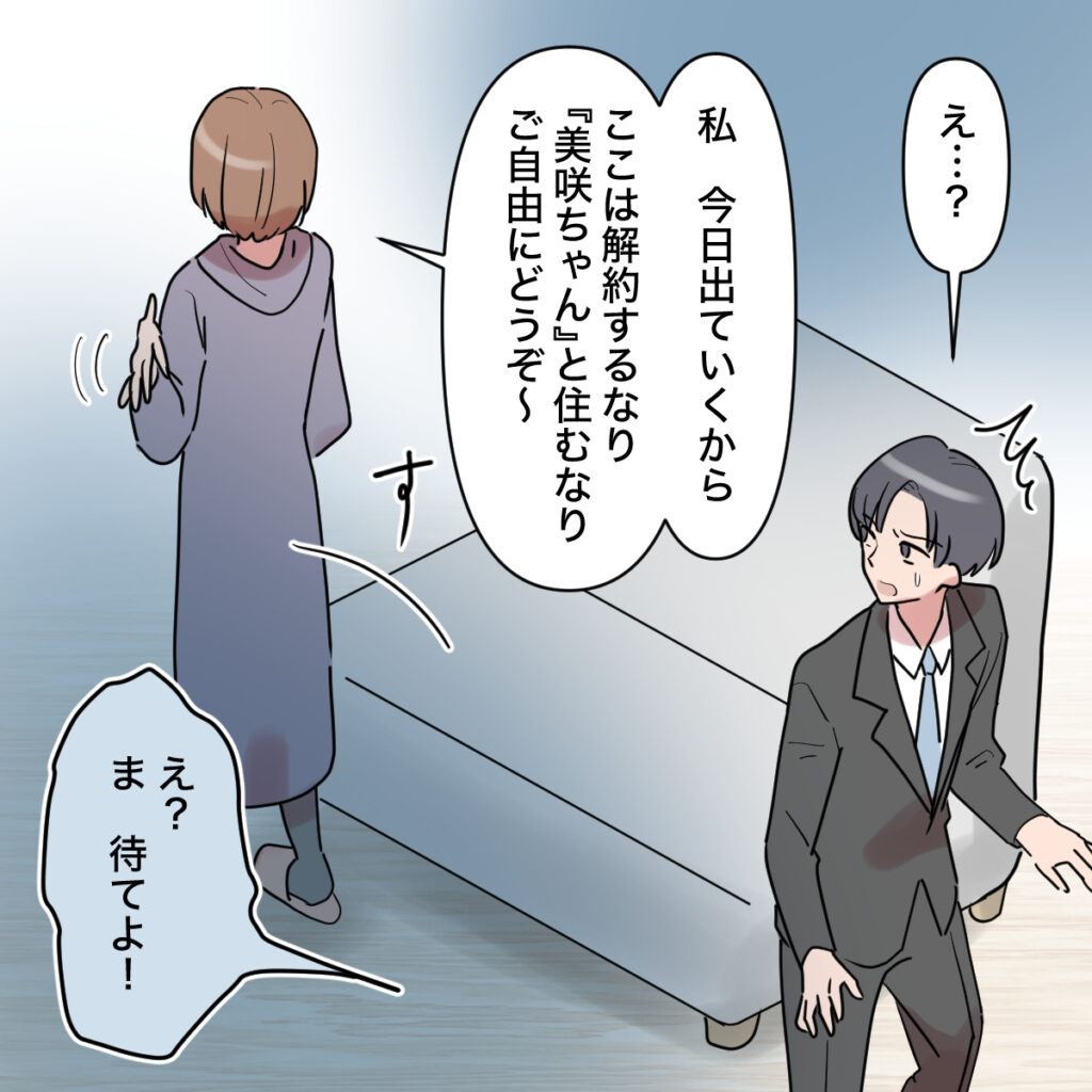 「え・・?」と驚いて振り向く和真。「私、今日出て行くから。ここは解約するなり『美咲ちゃん』と住むなりご自由にどうぞ~」そう言って立ち上がると、彼は「え?ま、待てよ」と慌て始めました。私は振り向くこともせず、部屋から出て行きました。