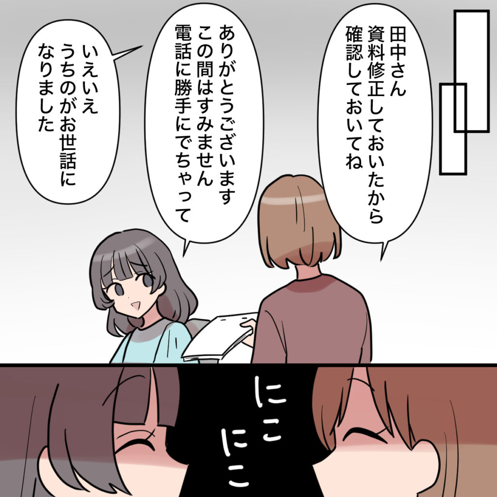 その後、会社に出社し、「田中さん、資料修正しておいたから確認しておいてね」そう言うと、「ありがとうございます。この間はすみません。電話に勝手にでちゃって」和真の電話に出たことをシレっと謝る田中さんに、「いえいえ、うちのがお世話になりました」そう言って、お互い作り笑いをしながら向き合ったのでした。