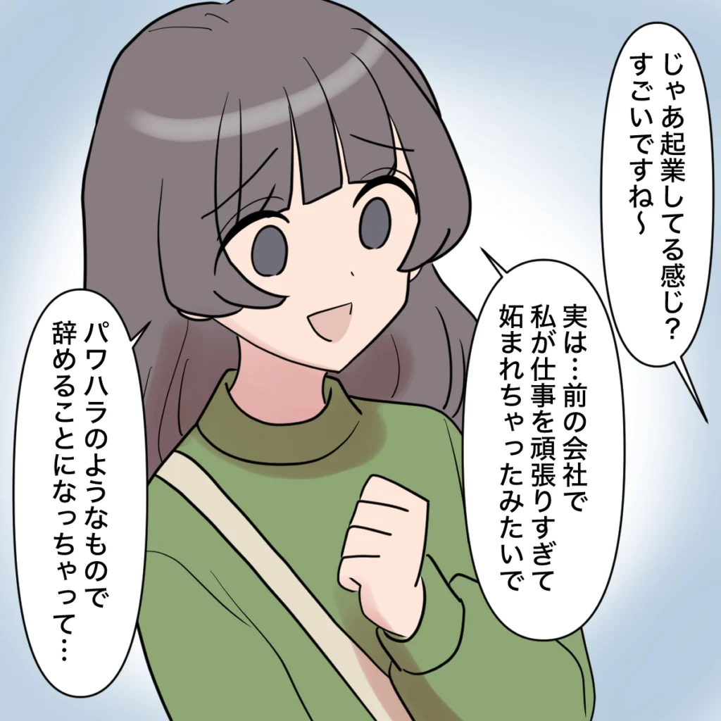 「じゃあ起業してる感じ?すごいですね~」ママ友にそう持ち上げられると、田中さんは得意げに「実は・・・前の会社で私が仕事を頑張りすぎて妬まれちゃったみたいで、パワハラのようなもので辞めることになっちゃって」と話し始めました。おそらく、私が彼女の教育係だった頃の話をしているんだと思います。