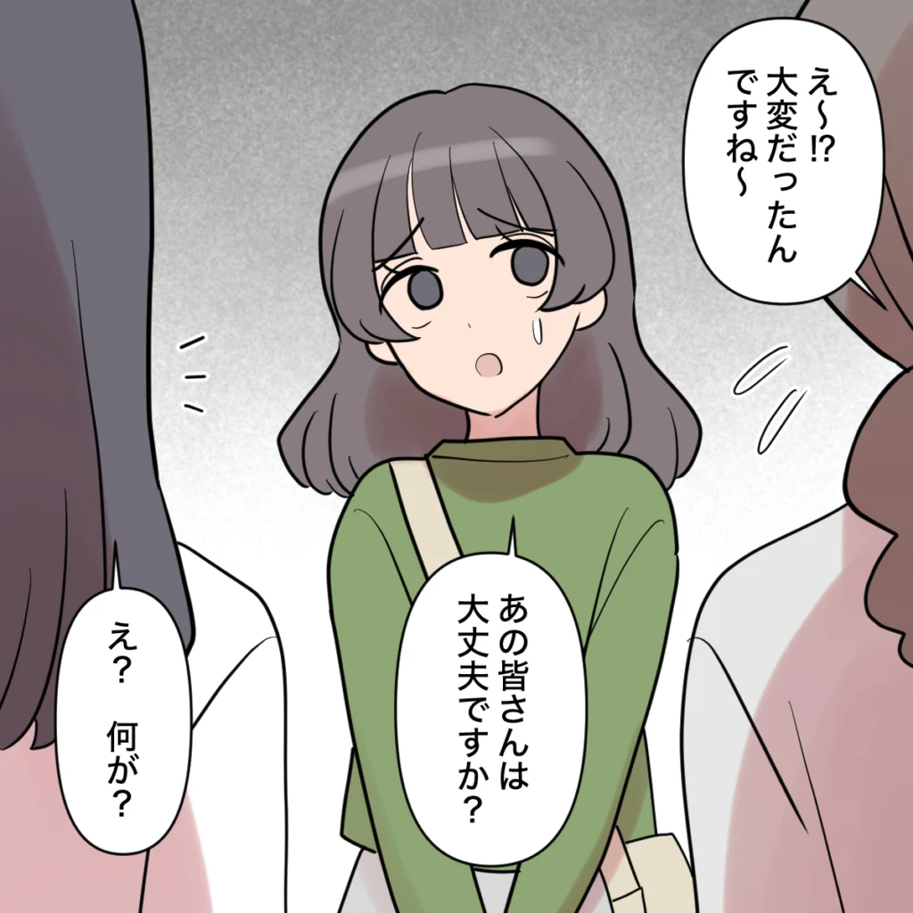 「え~!?大変だったんですね~」ママ友たちは、田中さんを気遣うように声をかけます。すると田中さんは、「あの、皆さんは大丈夫ですか?」と意味深な言葉を投げかけました。突然の問いにママ友たちは「え?何が?」と不思議そうに聞き返します。