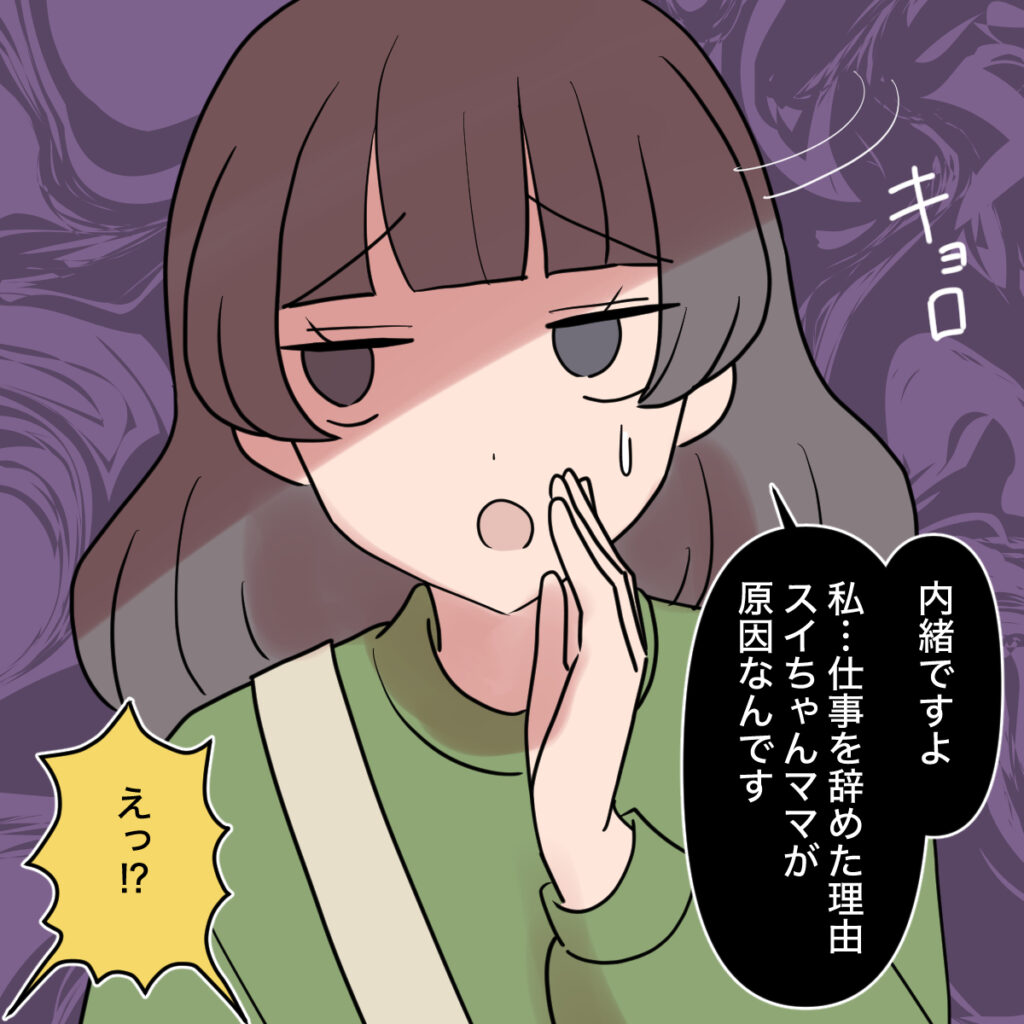 田中さんは、周りをキョロキョロと見渡すと、「内緒ですよ・・・私が仕事を辞めた理由、スイちゃんママが原因なんです」とママ友たちに小声で打ち明けました。それを聞いたママ友たちは「えっ!?」と驚きの声をあげます。