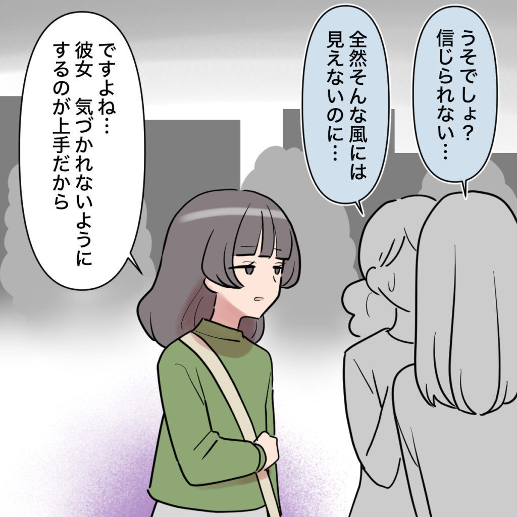 田中さんの話をすっかり信じてしまったママ友たちは、「うそでしょ?信じられない」「全然そんな風には見えないのに」と驚きの声を上げます。すると田中さんは神妙な表情で、「ですよね・・・彼女、気付かれないようにするのが上手だから」と言いました。