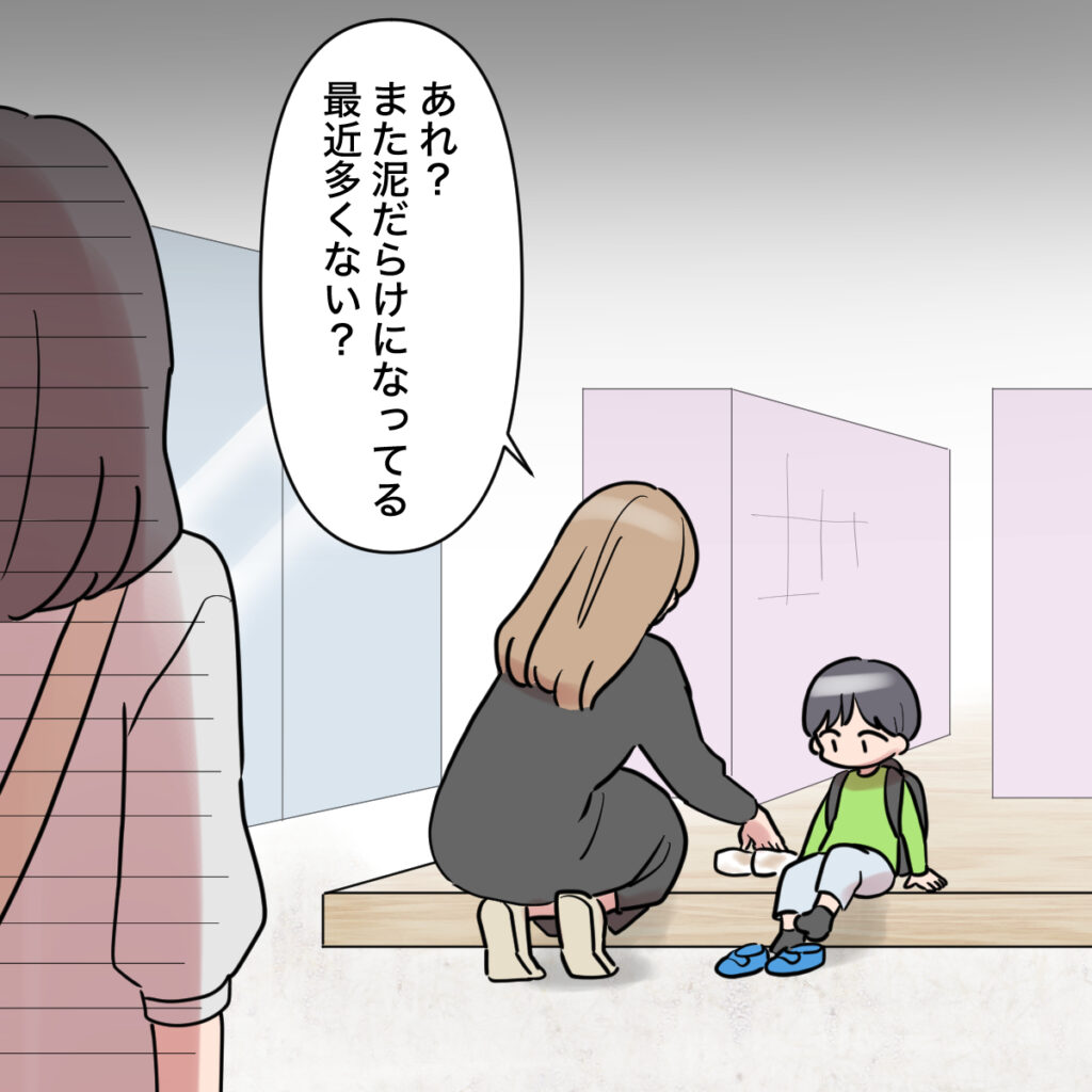 別の日。保育園の下駄箱で子どもの上履きを見ながら「あれ?また泥だらけになってる。最近多くない?」と話す1人のママを後ろからじっと見ていた田中さん。