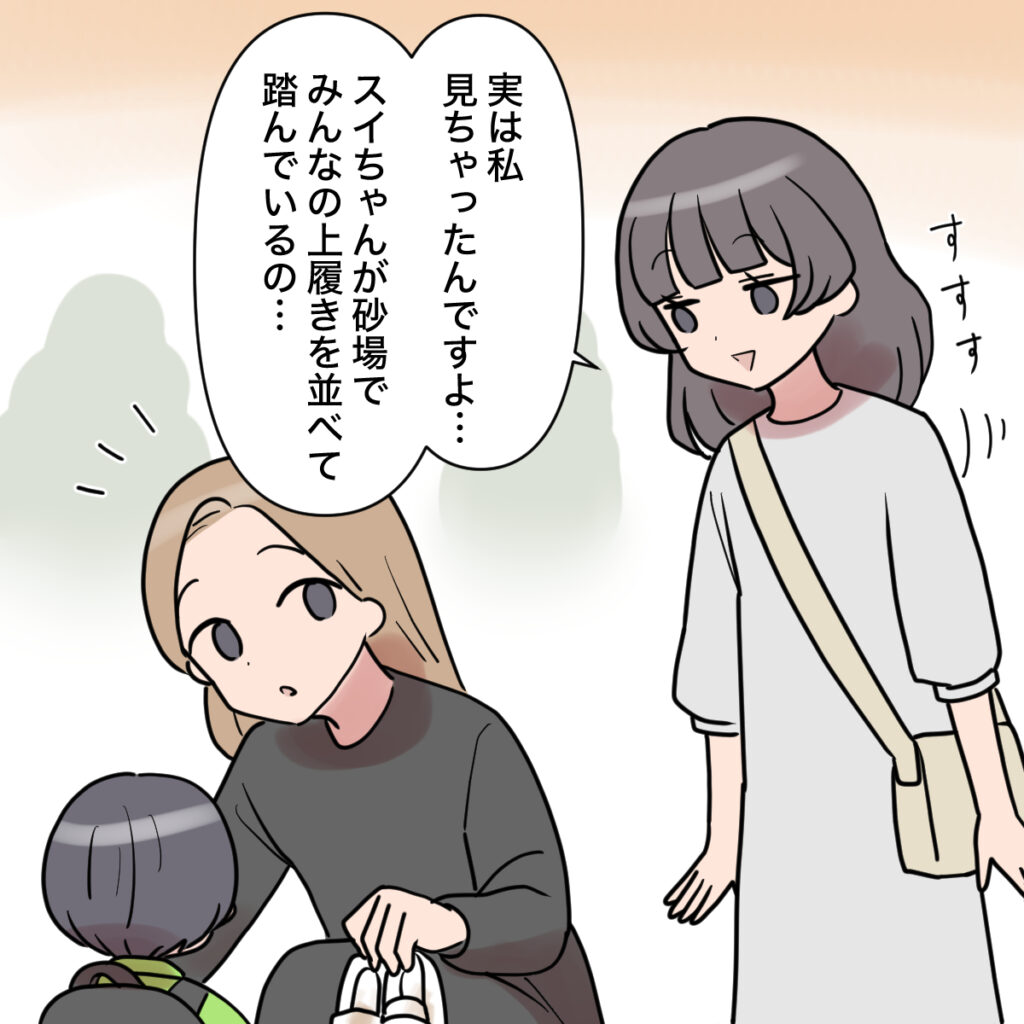 田中さんはすすすっと近寄ると、「実は私、見ちゃったんですよ・・。スイちゃんが砂場でみんなの上履きを並べて踏んでいるの・・」と心配そうに声をかけました。