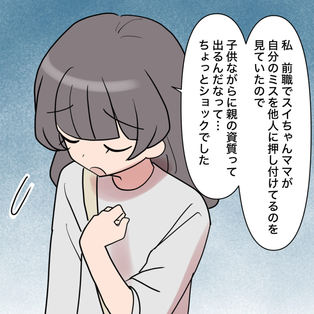 そして、ここでも「私、前職でスイちゃんママが自分のミスを他人に押し付けてるのを見ていたので・・子供ながらに親の資質って出るんだなって・・ちょっとショックでした」と心配している風を装いつつも結衣さんの印象が悪くなるように作り話をする田中さん。