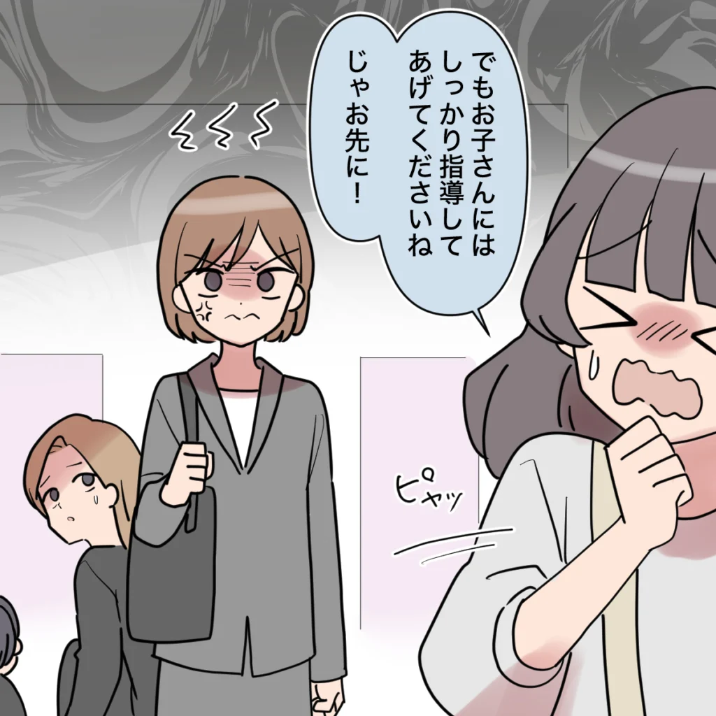 田中さんは「でも、お子さんにはしっかり指導してあげてくださいね。じゃお先に!」と言って逃げるように帰って行きました。勇気を振り絞って私に意見したように見える田中さんの姿は、私を怖がっているように周りに見えていると思います。昔と変わらずなぜか私の印象を悪くしようとする田中さんに怒りがこみ上げてきました。さっきのママも田中さんの言葉を信じてしまったかもしれませんが、言い訳すると逆効果な気がして・・私は何も言いませんでした。