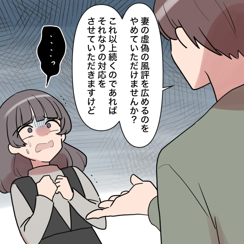 「妻の虚偽の風評を広めるのをやめていただけませんか?これ以上続くのであればそれなりの対応をさせていただきますけど」と険しい表情で迫る健太に、田中さんは顔面蒼白で何も言えません。