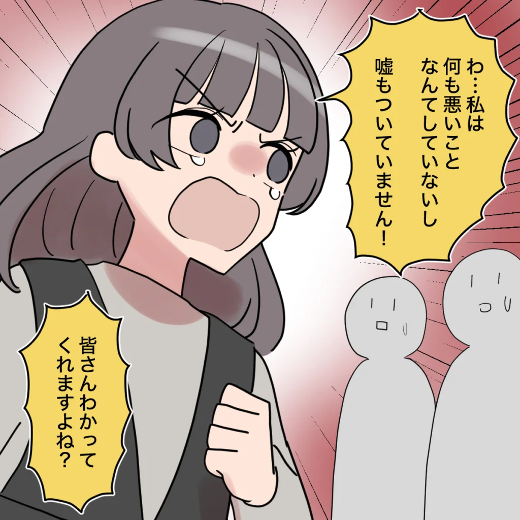 この状況になっても自分の非を認めない田中さんは「わ・・私は何も悪いことなんてしていないし、嘘もついてません!皆さんわかってくれますよね?」と泣きながら周りの保護者に助けを求め始めました。田中さんに同意を求められた保護者たちはみんな困惑した表情を浮かべていました。都合が悪くなると泣いて周りの同情を引こうとするところもあの頃のままです。