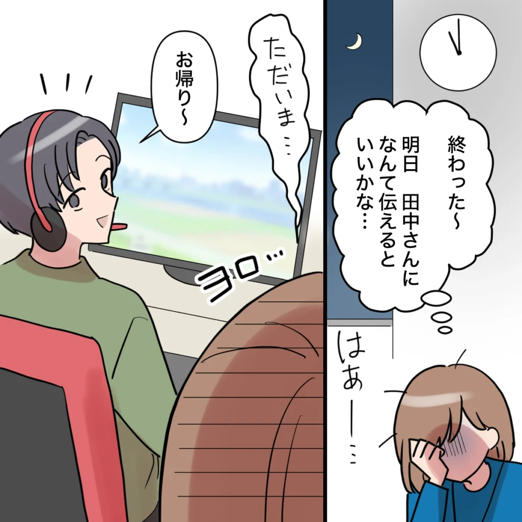 結局、資料を修正するのに5時間近くかかってしまいました。明日、田中さんに今回のことをどう伝えるべきか考えながら、私は重い足取りで帰路につきます。新入社員の教育係が、ここまで神経を使うものだとは思ってもいませんでした。ヨロヨロとした足取りで帰宅すると、和真はゲームの真っ最中。私の帰宅に気付くと、「おかえり~」と声をかけてくれました。
