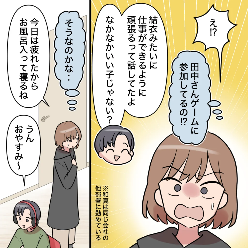 「なぁなぁ、美咲ちゃんって結衣が教育係になってる子?」和真に突然そう聞かれ、私は戸惑いながら「え・・・そうだけど、どうしたの?」と返します。すると彼は、「このゲームのメンバーに今日から入ったからさ」と聞かされます。思いがけない繋がりに、私は驚いてしまいました。