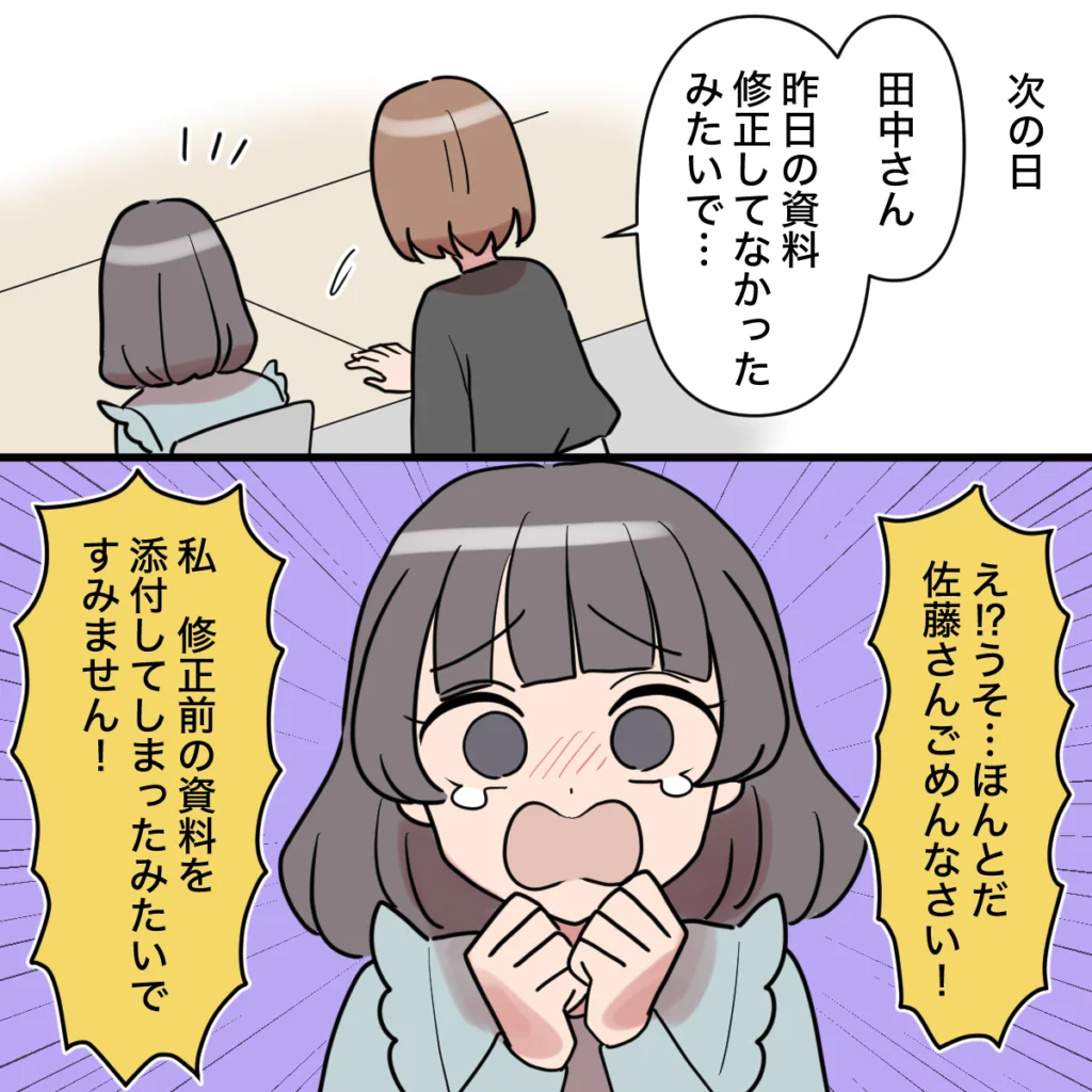 そして次の日。私は出勤してきた田中さんに、「あのね、昨日の資料修正してなかったみたいで・・・」と声をかけます。すると田中さんは「え!?うそ・・・私、修正前の資料を添付してしまったみたいで、すみません!」と言って泣き出してしまいました。