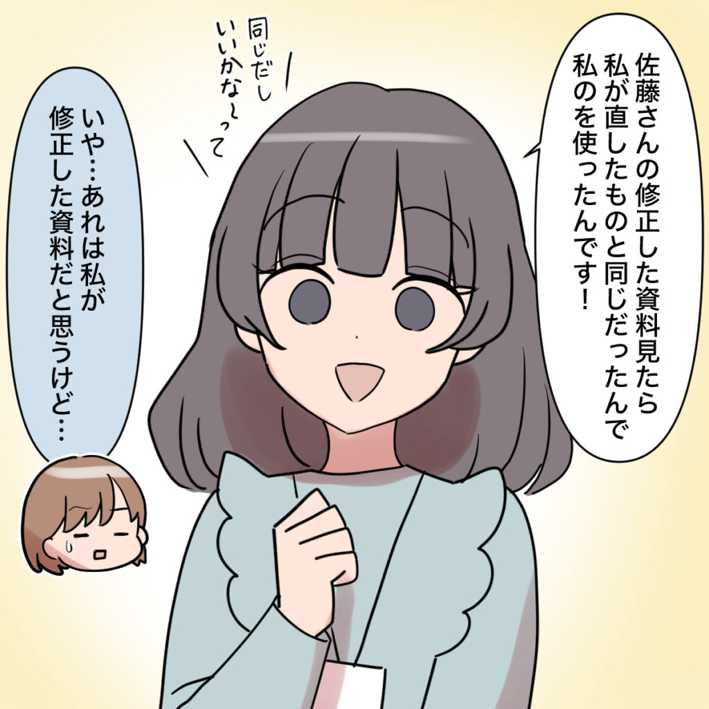 「佐藤さんの修正した資料を見たら、私が直したものと同じだったので、私のものを使ったんです!」と平気な顔で嘘をつく田中さん。私は顔を引きつらせながら「いや・・・あれば私が修正した資料だと思うけど」と彼女の発言を訂正しました。
