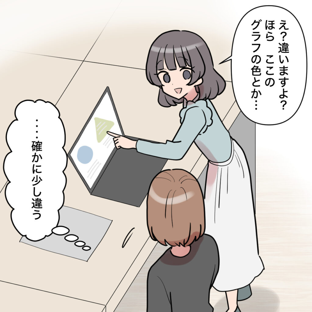 しかし田中さんは、私の修正した資料だという事実を頑なに認めようとしません。「え?違いますよ?ほら、ここのグラフの色とか」と資料を指さし、意地でも自分のものだと言い張ります。確かに私の資料とは微妙に色が違うけど・・・。