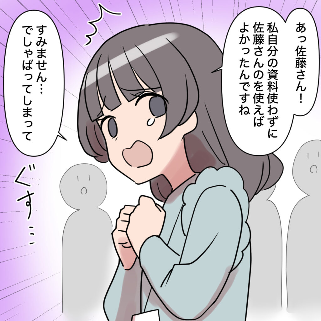 すると田中さんは、目に涙を浮かべながら「あっ、自分の資料を使わずに、佐藤さんのものを使えばよかったんですね!すみません、でしゃばってしまって」と社内のみんなに聞こえるような声で言い出しました。