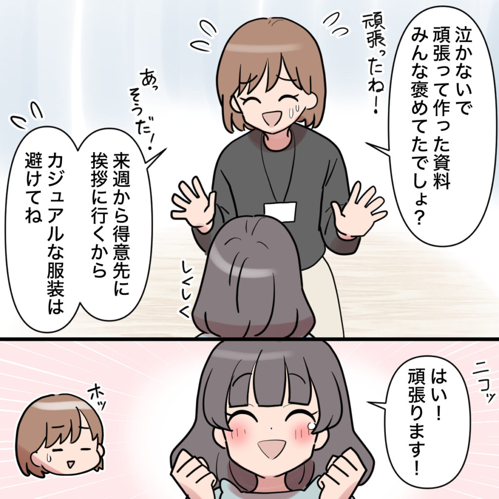 私は面倒なことになる前に、必死で田中さんをなだめました。「泣かないで、頑張って作った資料みんな褒めてたでしょ?」さらに気をそらすように、「あっ!そうだ来週から得意先に挨拶に行くから、カジュアルな服装は避けてね」と話題を変え、機嫌を取ります。すると田中さんは満足したのか、「はい!頑張ります」と笑顔に。その様子を見て、私はホッと胸を撫でおろしました。