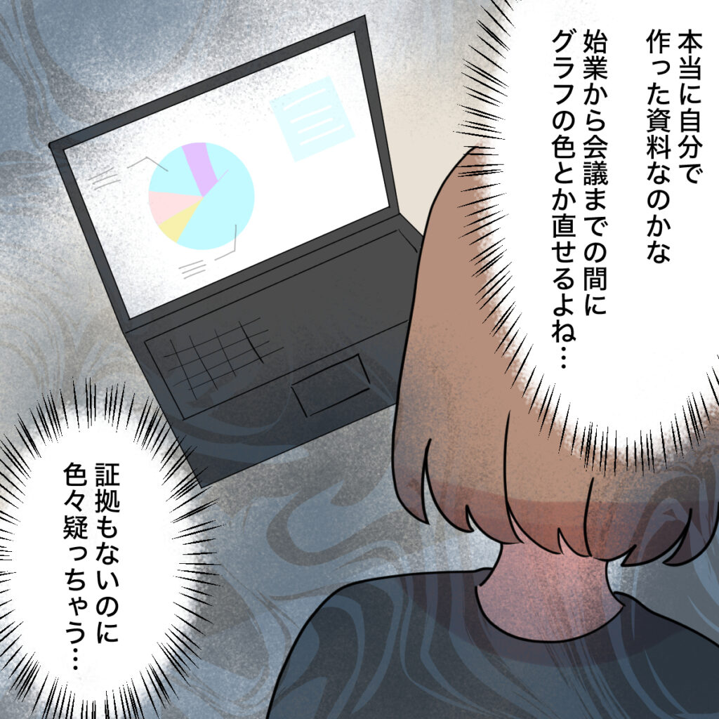 でも、本当に自分で作った資料なのかな。田中さんは「グラフの色が違う」と言っていたけど、グラフの色なんて、始業から会議までの間でも簡単に直せるよね。証拠もないのに、色々疑ってしまう自分がいました。