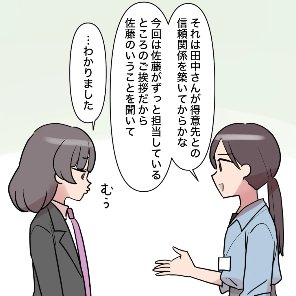 藤澤さんが「それは田中さんが得意先との信頼関係を築いてからかな。今回は佐藤がずっと担当しているところのご挨拶だから佐藤の言うことを聞いて」と諭すように言うと、田中さんは不服そうにしながらも「・・わかりました」と渋々納得してくれました。