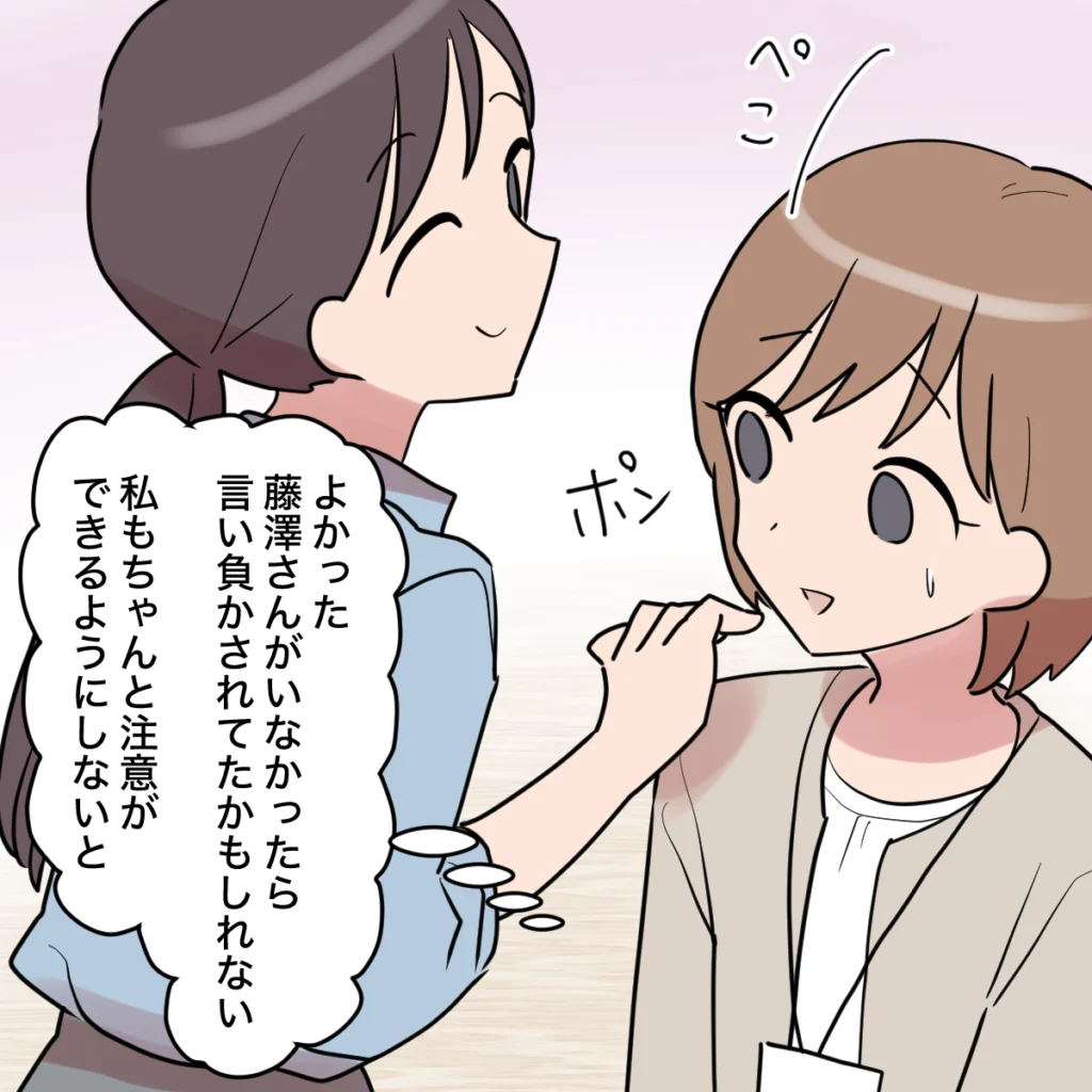 藤澤さんは私の肩をポンと叩きながら目配せして自分の席に戻って行きました。「よかった。藤澤さんがいなかったら言い負かされてたかもしれない。私もちゃんと注意ができるようにしないと」私は藤澤さんの対応力を見習いたいと思いました。
