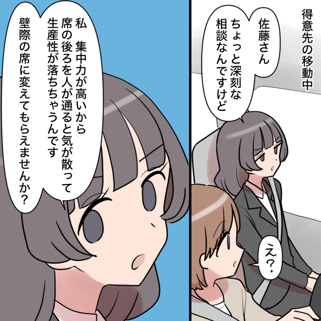 藤澤さんのおかげでネクタイの件は解決して一安心。気を取り直して車で得意先に向かっていると、助手席の田中さんが唐突に「佐藤さん、ちょっと深刻な相談なんですけど」と神妙な面持ちで切り出しました。深刻な相談と言われ身構えていると、「私、集中力が高いから、席の後ろを人が通ると気が散って生産性が落ちちゃうんです。壁際の席に変えてもらえませんか?」と真顔で言った田中さん。