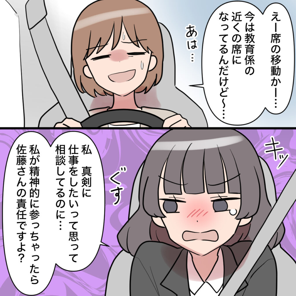 予想外の相談内容に拍子抜けした私。色々なことを考慮したうえで今の席の配置になっているため私の一存で「いいよ」とも言えず、「えー、席の移動かー・・。今は教育係の近くの席になってるんだけど~・・」と言葉を濁していると、「私、真剣に仕事をしたいって思って相談してるのに・・。私が精神的に参っちゃったら佐藤さんの責任ですよ?」と涙を浮かべながら強い口調で言われて返答に困ってしまいました。