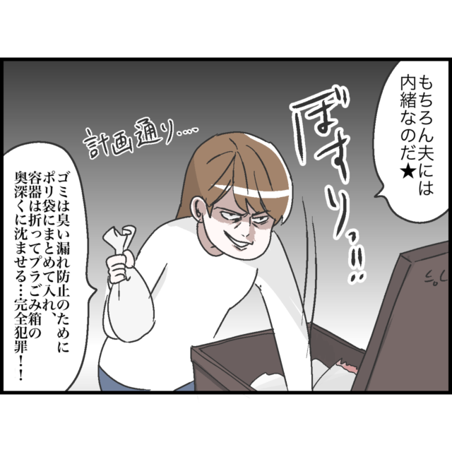 「もちろん夫には内緒!なので、ゴミは臭い漏れ防止のため、ポリ袋にまとめて入れて、陽気は折ってプラごみ箱の奥深くに沈ませる・・これぞ完全犯罪!!」