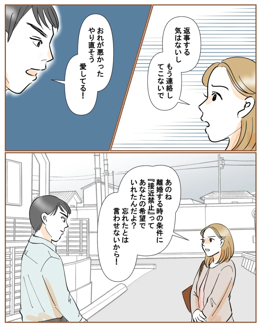 「返事する気はないし、もう連絡してこないで」私は迷惑していることを、はっきりと和也に伝えました。しかし返ってきたのは、「俺が悪かった・・・やり直そう、愛してる!」というこちらの言葉をまるで理解していない返事。私は和也に「あのね、離婚するときの条件に『接近禁止』ってあなたの希望でいれたんだよ?忘れたとは言わせないから」と強く言い返しました。