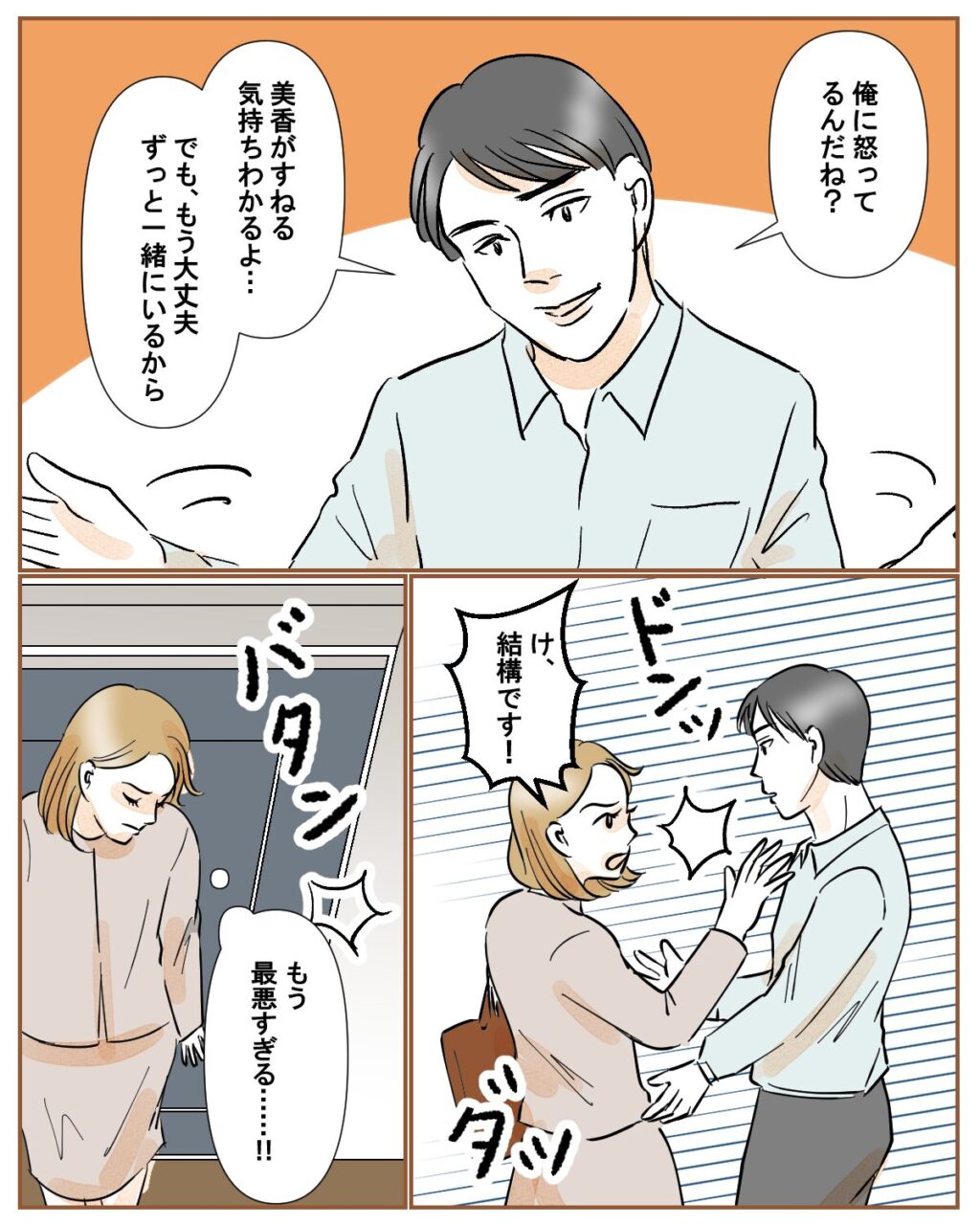 「俺に怒ってるんだね?美香がすねる気持ちわかるよ・・・でももう大丈夫、ずっと一緒にいるから」私が拗ねているだけだと本気で思っているのか、和也は見当違いなことを言いました。私は抱きつこうとする和也の胸を「け、結構です!」と強く押し返し、そのまま逃げるように部屋へ駆け込みました。