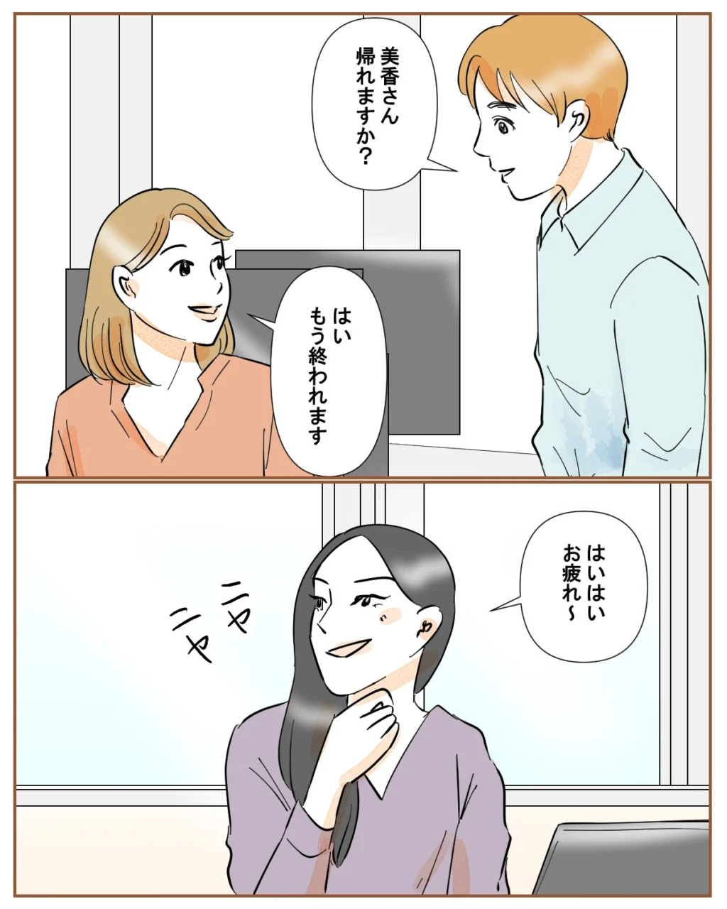 毎日就業時間になると「美香さん帰れますか?」と聞きに来てくれる佐藤さん。「はい、もう終われます」と、ドキドキしていることが周りには伝わらないように、なるべく何でもないように答えているけれど、麗子はニヤニヤしながら「はいはいお疲れ~」と言って私たちを見送ってくれるのでした。