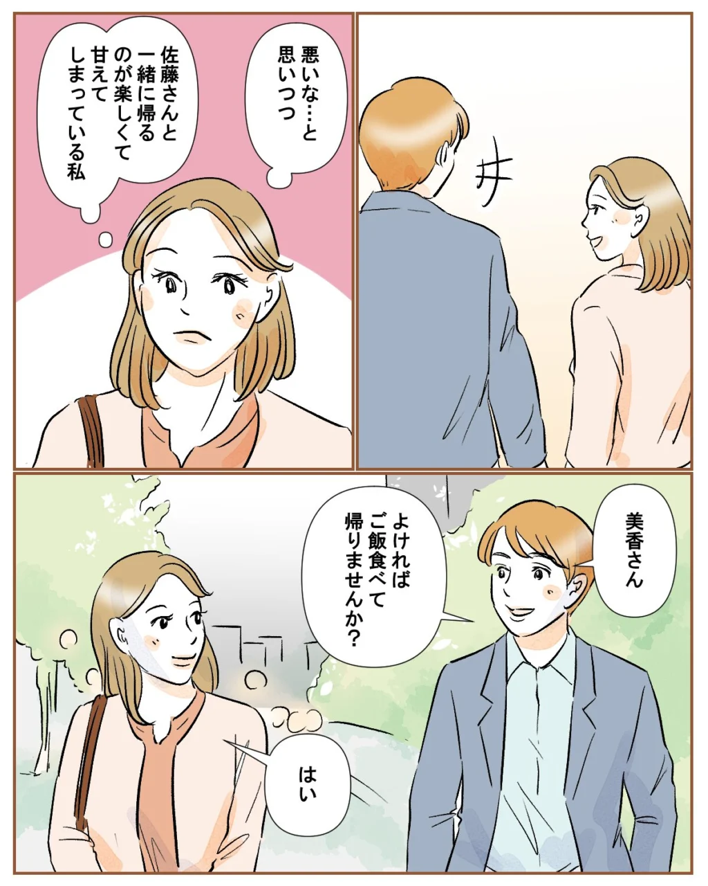 毎日佐藤さんに送ってもらうのは悪いな、と思いつつも、一緒に帰るのが楽しいから甘えてしまっています。仕事が遅くなって日には、時々一緒に食事をして帰ることもありました。この日も佐藤さんが食事に誘ってくれたので行こうとしていると