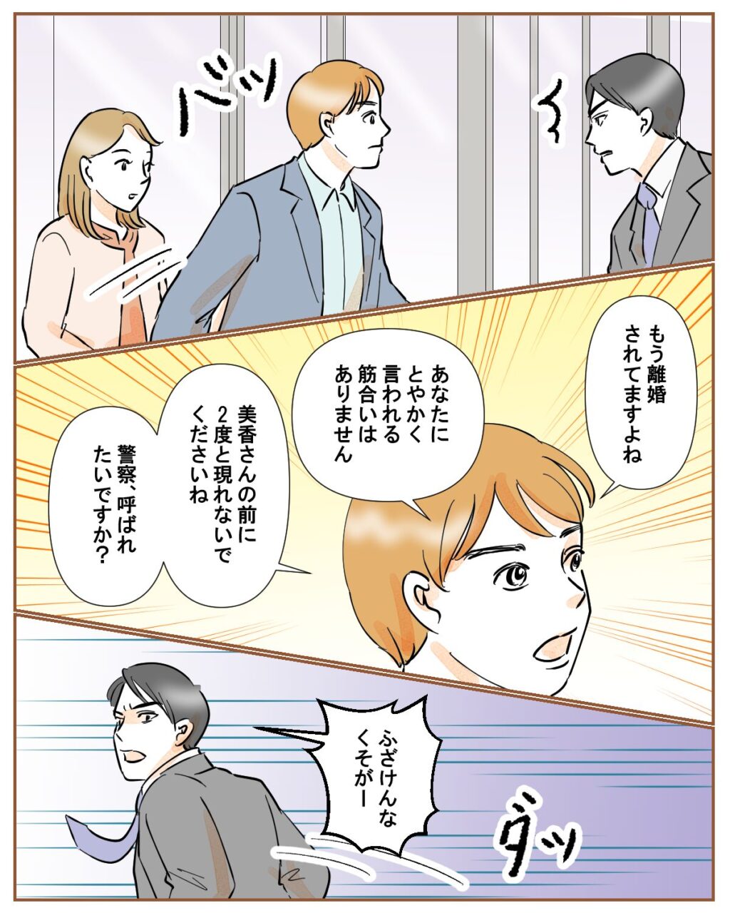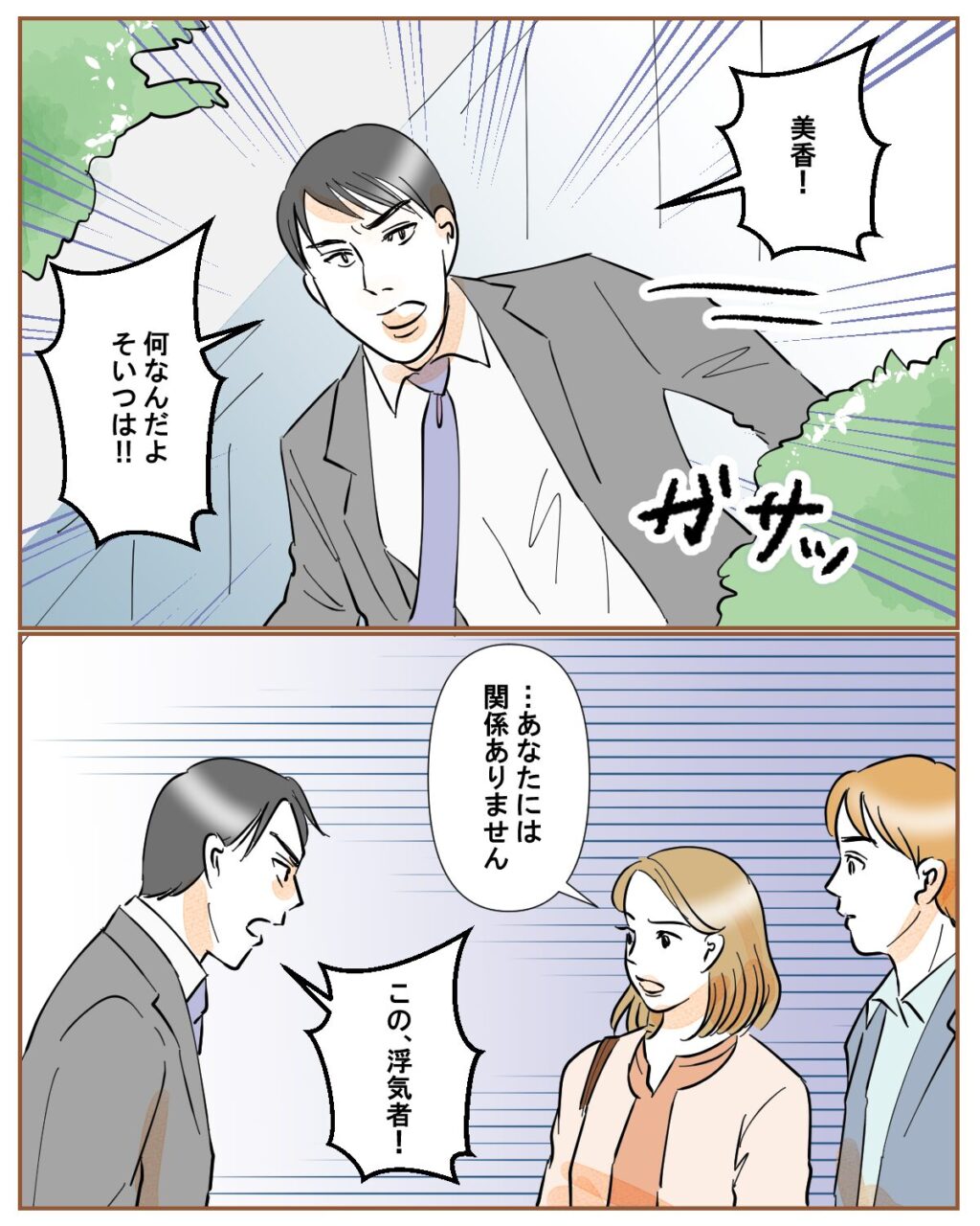 「美香!」と突然物陰から飛び出してきたのは和也!厳しい顔をして「なんなんだよそいつは!」と言いながら近づいてきました。本当にしつこい。「あなたには関係ありません。」と答えると「この、浮気者!」と怒鳴られてしまいました。どの口が?あなたの浮気で私たち離婚したのよ?本当に自分勝手な和也に呆れていると