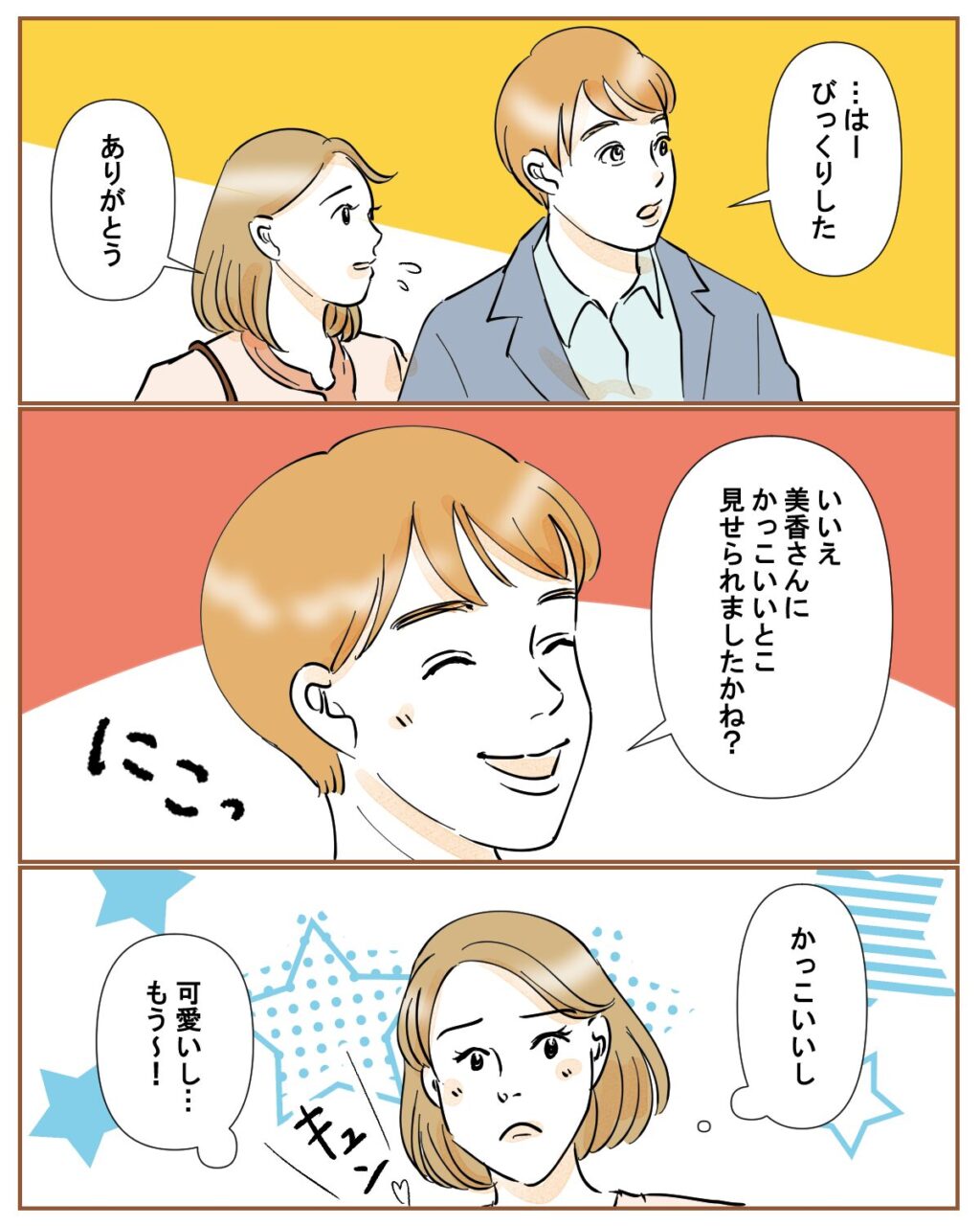 和也が見えなくなると、佐藤さんは「はーびっくりした」といつもの穏やかな佐藤さんに戻って言いました。お礼を言った私に「いいえ、美香さんにかこいいとこ見せられましたかね?」とにっこり笑う佐藤さん。そんな姿を見せられたらカッコいいし可愛いし・・・ときめいてしまいました。