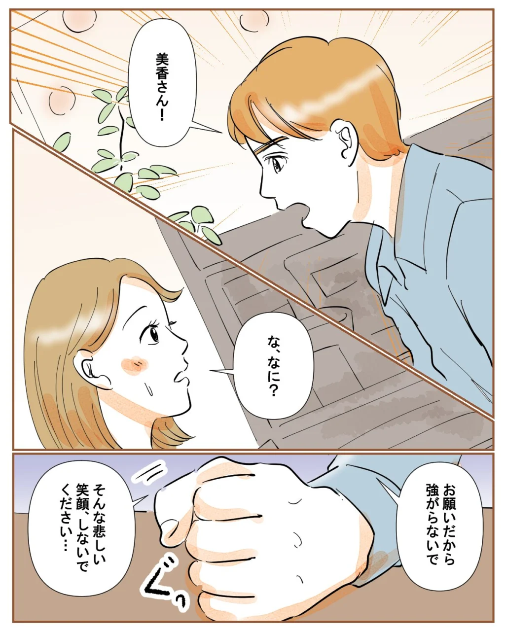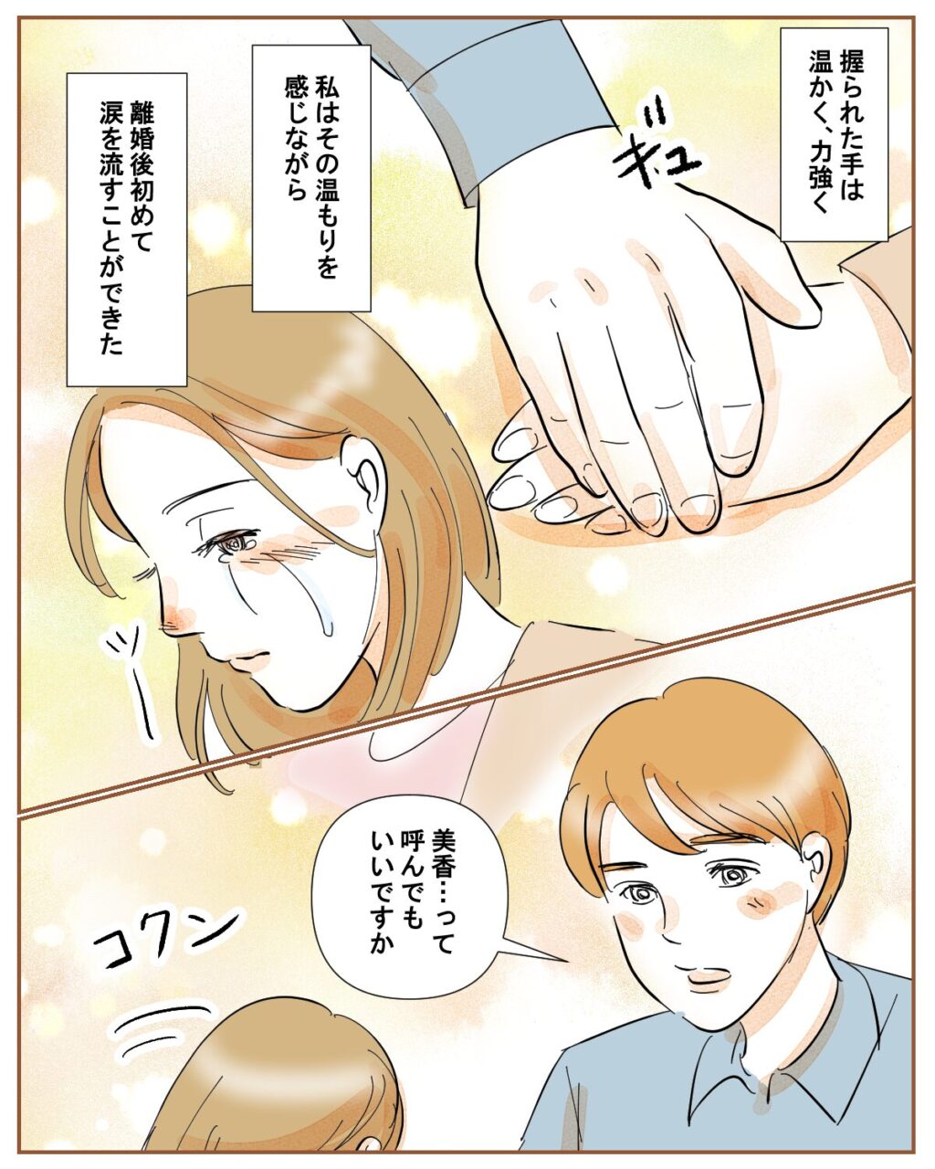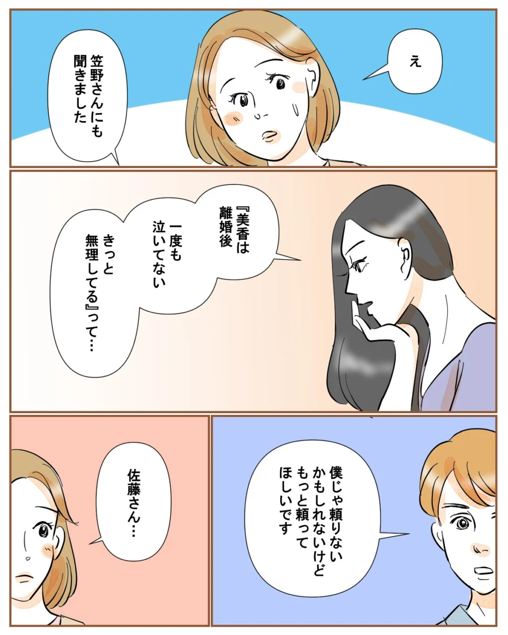 「え」と何を言っていいのか分からない私。すると「笠野さんにも聞きました」と切り出す佐藤さん。「『美香は離婚後、一度も泣いてない。きっと無理してる』って・・」麗子がそう言っていたと聞いて驚く私に、「僕じゃ頼りないかもしれないけど、もっと頼ってほしいです」佐藤さんにそう言われ、「佐藤さん・・」と呟いてしまいました。