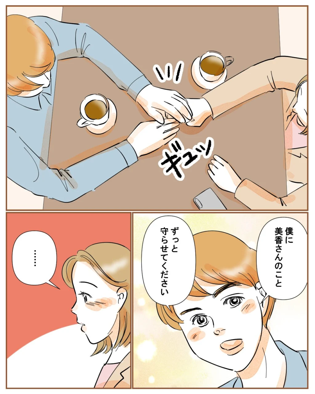すると、佐藤さんは突然私の手を握りしめて、「僕に美香さんのこと、ずっと守らせてください」と真っ直ぐな瞳で言いました。あまりに突然の出来事に、言葉が出てきませんでした。