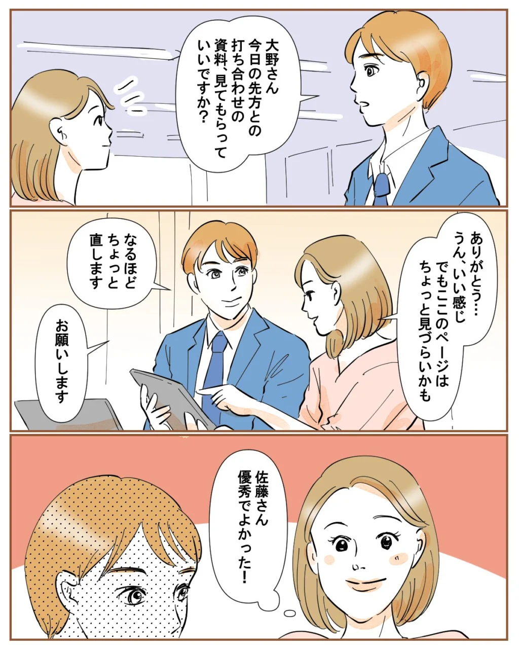 その後、私と佐藤さんは先方との打ち合わせに向けて準備を開始。佐藤さんの作った資料を確認し修正箇所を伝えると、すぐに対応してくれるなどやり取りもスムーズにできるし、報連相もしっかりしてくれるので仕事がやりやすいです。「佐藤さん、優秀でよかった!」と安心しました。
