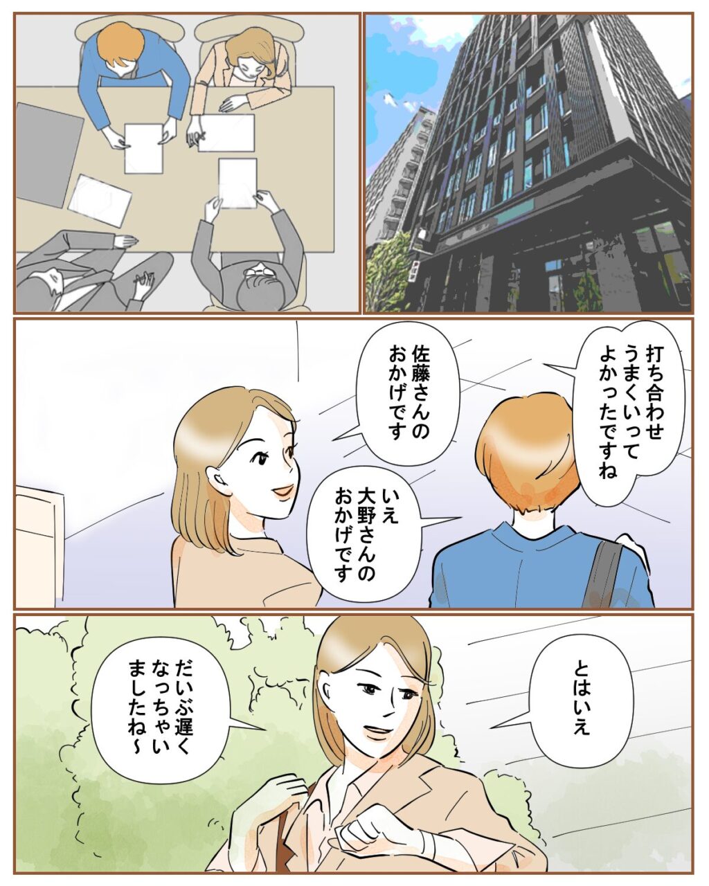 そして先方との打ち合わせ当日。しっかり準備したおかげでうまくいきました。「打ち合わせ、うまくいってよかったですね。佐藤さんのおかげです」「いえ、大野さんのおかげです」と二人でホッとしながら先方の会社を出た私たち。「とはいえ、だいぶ遅くなっちゃいましたね~」と時計を見ながら呟くと、