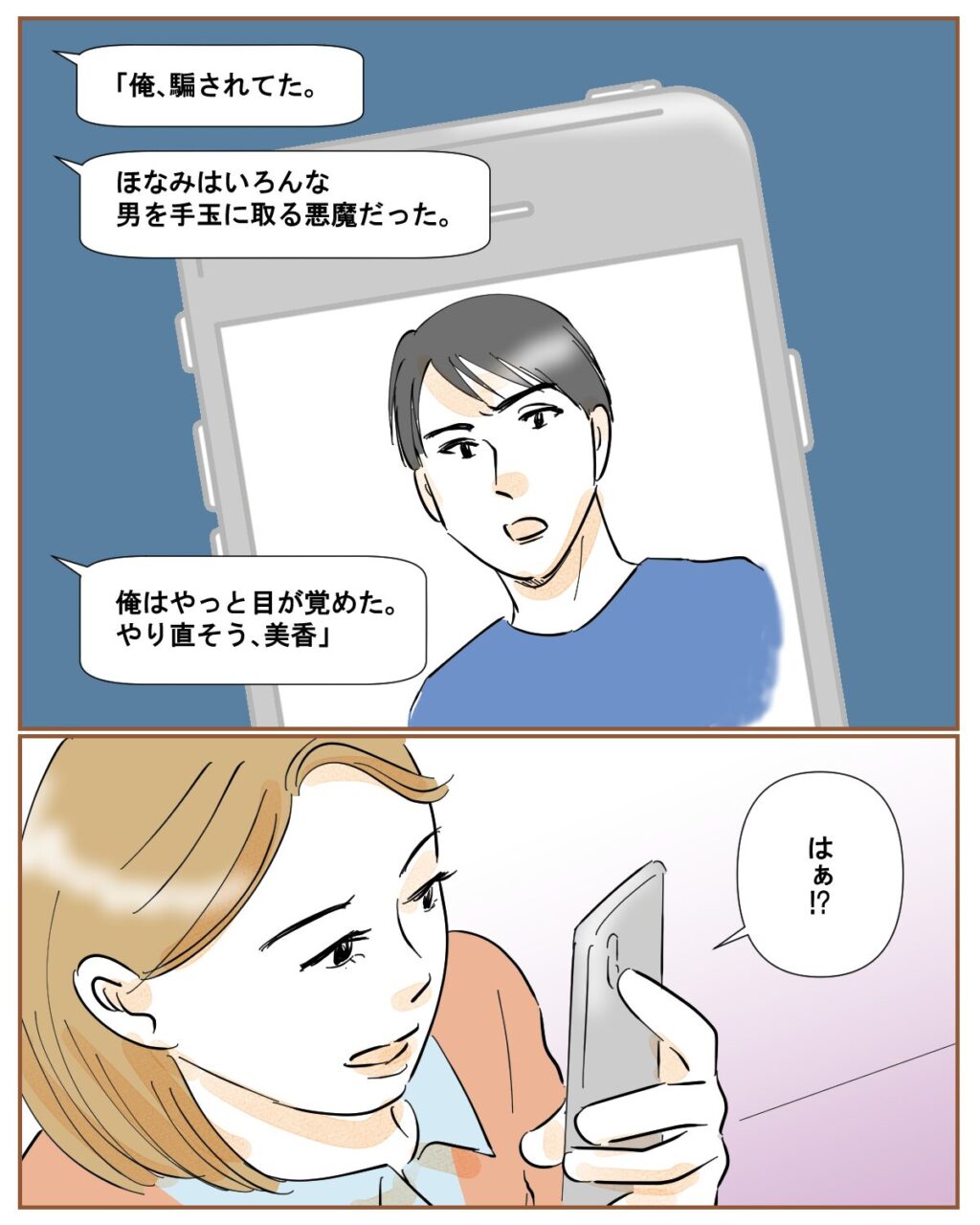 メッセージを開くと、そこには「自分はほなみさんに騙されていたこと」と「彼女は多くの男性を手玉に取る悪魔のような存在だったこと」そして「今さらながら私とやり直したいと思っていること」がつらつらと綴られていました。あまりにも身勝手な内容に、私は思わず「はぁ!?」と口に出してしまいました。