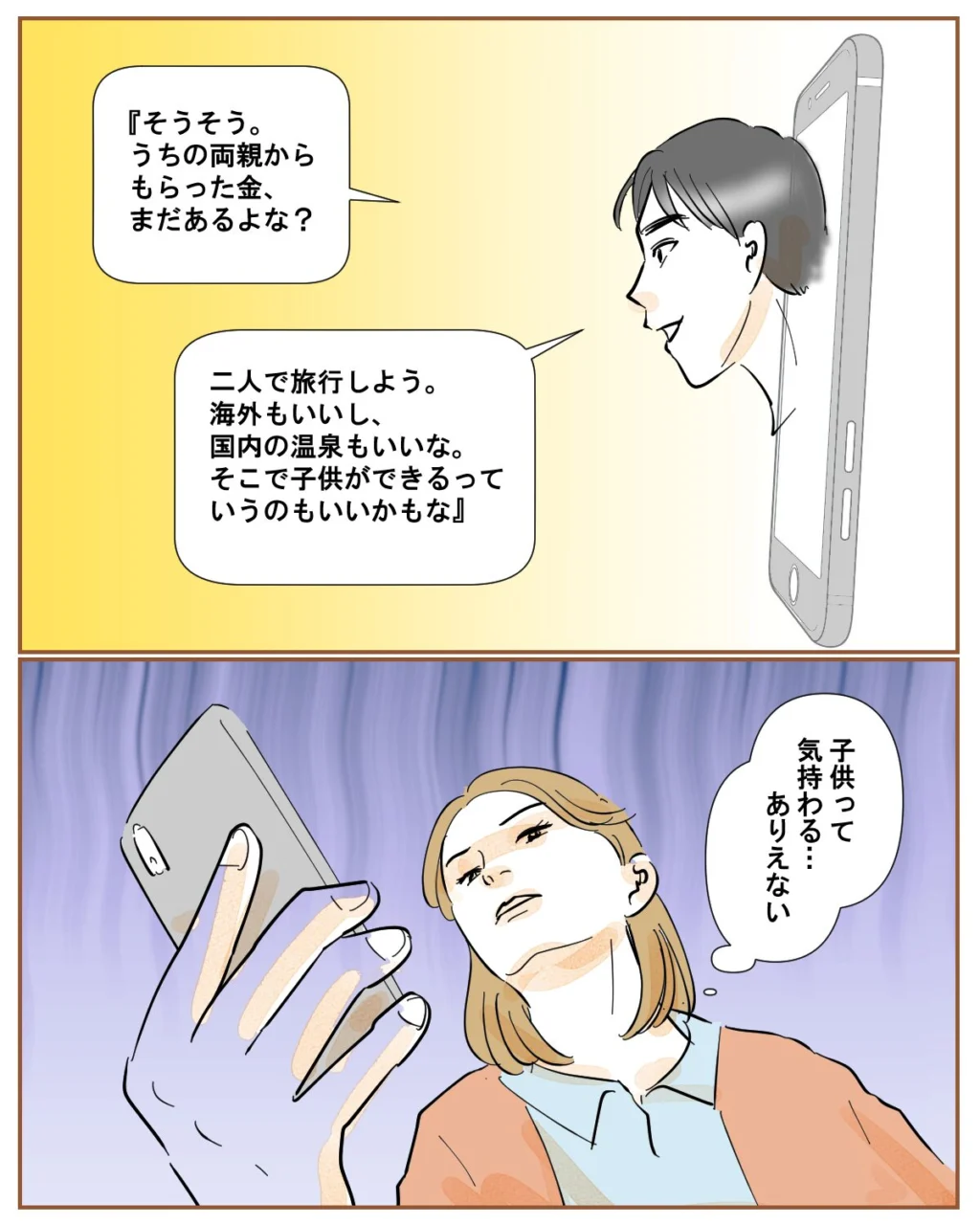 和也の戯言は、それだけでは終わりませんでした。「うちの両親からもらった金、まだあるよな?2人で旅行しよう、海外もいいし国内の温泉もいいな、そこで子どもができるっていうのもいいかもな」と気持ちの悪い妄想を、一方的に並べ立ててきたのです。メッセージを見て、思わず背筋が凍りました。子どもって・・・別れた相手に向かってよくそんなことが言えるわね。