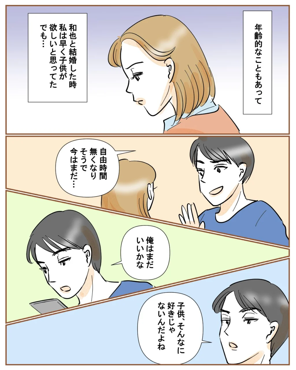 年齢的なこともあって、和也と結婚した時、私は早く子どもが欲しいと思っていました。だけど和也は、「自由な時間がなくなりそうだから今はまだ」「俺はまだいいかな」「正直子どもってそんなに好きじゃないんだよね」と何かと理由をつけては、子どもの話を先延ばしにしました。
