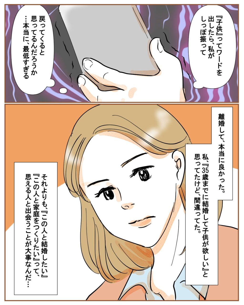 『子ども』というワードを出したら、私がしっぽを振って戻ってくると思ったのでしょうか。考えが浅はかすぎます。離婚して本当によかった。35歳までに結婚して子どもが欲しいと思ってたけど、それは間違いでした。それよりも『この人と結婚したい』『この人と家庭をつくりたい』って思える人と出会うことが大事なんだと、和也と別れた今、思いました。