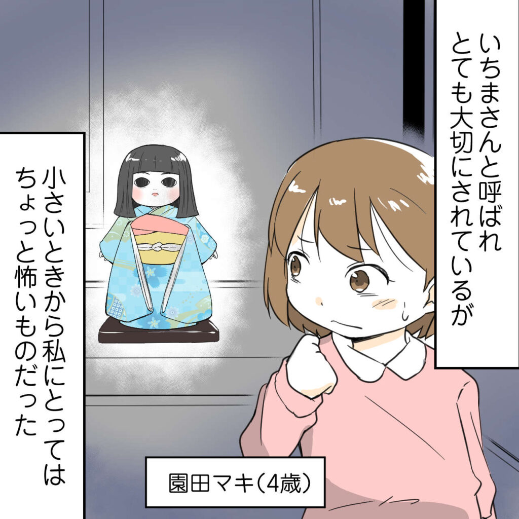 おかっぱの黒髪は櫛できれいにとかされ、立派な着物はきちんと整えられているその市松人形は家族に「いちまさん」と呼ばれ大切にされています。でも幼少期、当時4歳だった私にとってはいちまさんの風貌は少し怖いものでした。