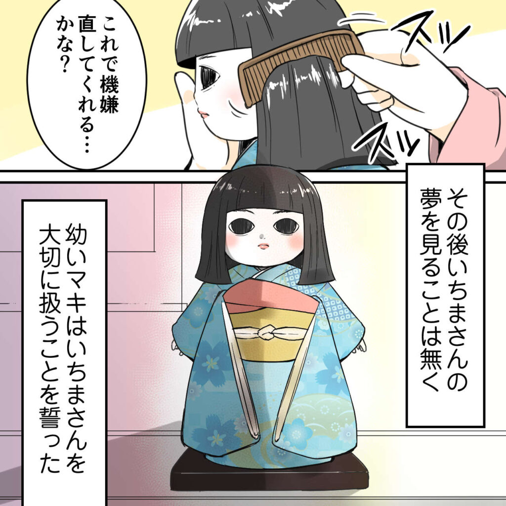 昔から大切にされている市松人形を雑に扱ってしまった罪悪感からなのか、本当にいちまさんの意思で夢に現れたのか・・・不思議ですね。そしてちょっと怖いです。