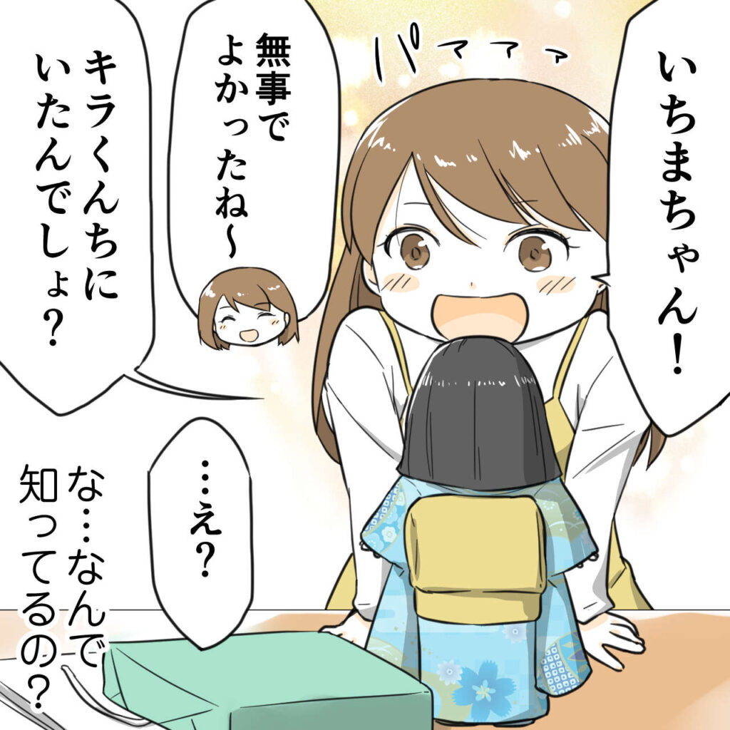 いちまさんを床の間に戻すと、「いちまちゃん!」と喜ぶユカに「無事でよかったね~」と声をかけると、「キラくんちにいたんでしょ?」と言い出して「・・え?な、なんでしてるの?」とビックリ!!