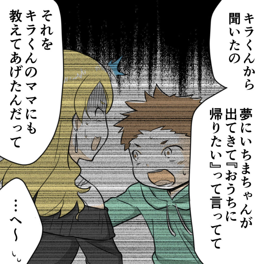 すると、「キラくんから聞いたの。夢にいちまちゃんが出てきて[おうちに帰りたい』って言ってて、それをキラくんおママにも教えてあげたんだって」ユカの言葉に「・・へ~」と答えたものの、