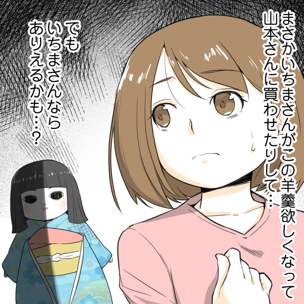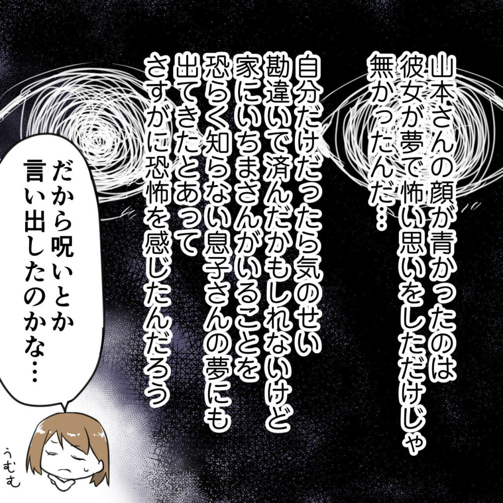 「山本さんの顔が青かったのは、彼女が夢で怖い思いをしただけじゃなかったんだ・・。自分だけだったら気のせい、勘違いで済んだものかもしれないけど、家にいちまさんがいることをおそらく知らない息子さんの夢にも出てきたとあって、さすがに恐怖を感じたんだろう。だから呪いとか言い出したのかな・・」と考え込みました。